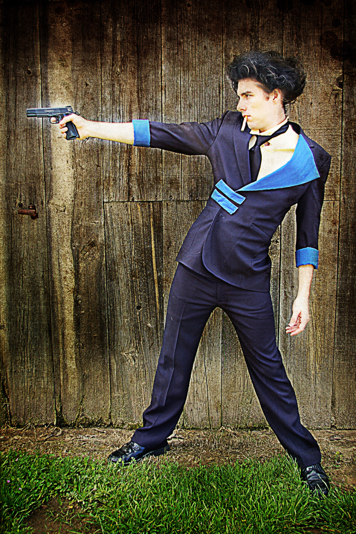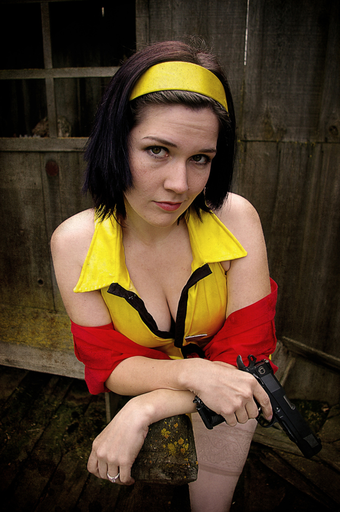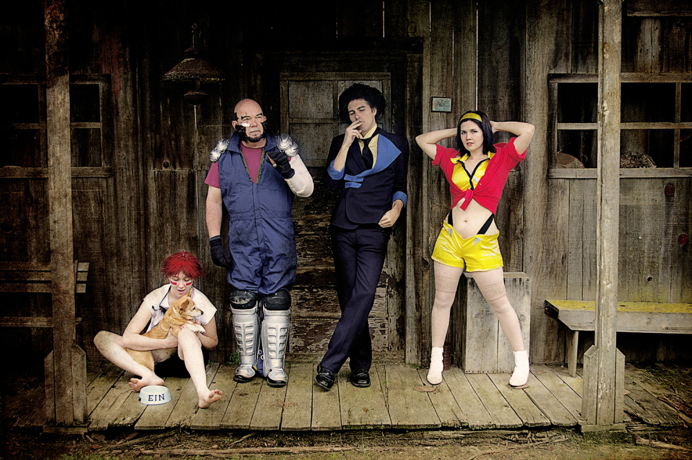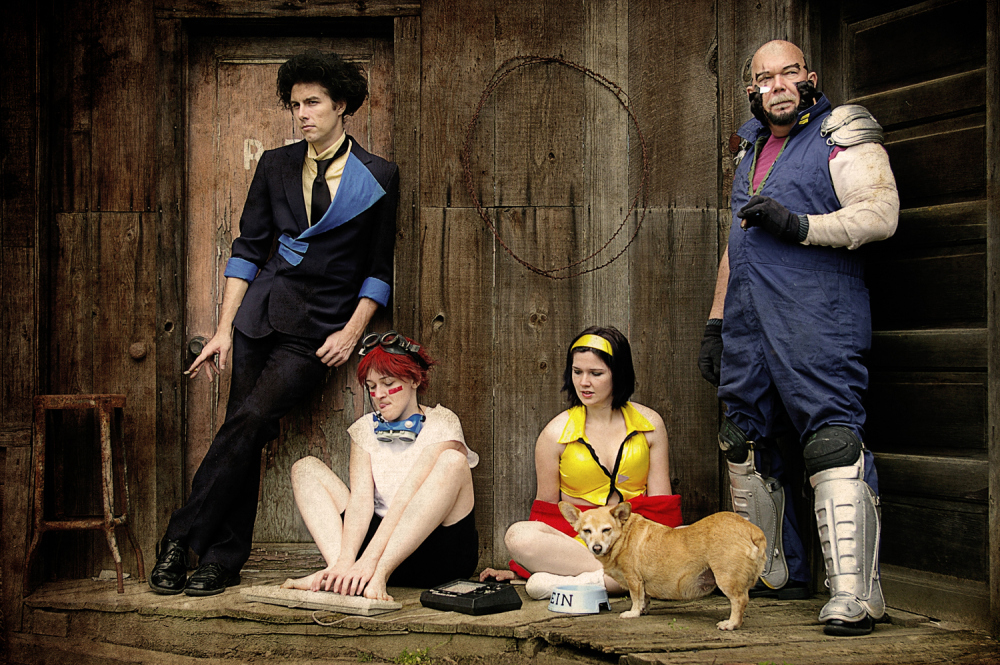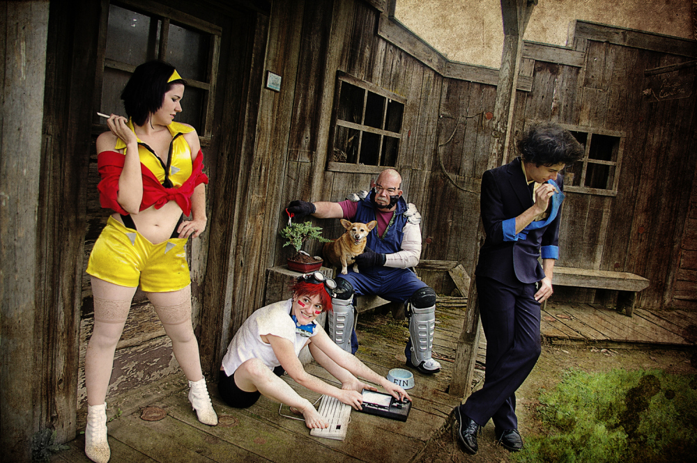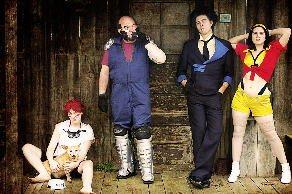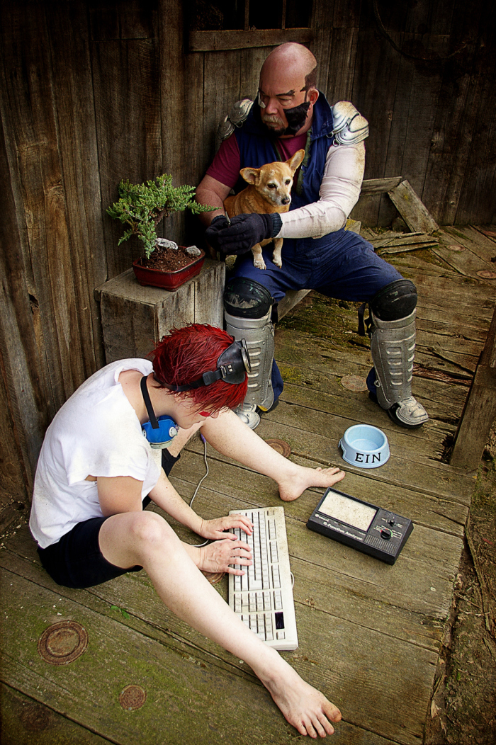 In March of 2011 I was working at the Kings County Library and one of our regular anime-loving patrons returned some Cowboy Bebop DVDs. I was always showing the geeky patrons our cosplay photos, and when they asked if I’d done Bebop yet I said no, but we would eventually… especially since my parents dog Brandi would be a perfect little Ein. Then I started thinking.. Brandi isn’t as young as she used to be, and she’s got health problems. I have planned for YEARS to have her be our Ein… what if something should happen.. I’d be so sad that we waited. So I ran the idea by my parents, my sister, and my (at the time) fiance and they all said, “Let’s dooo eeeet!”…. or something to that effect. (About a year after this photoshoot, Brandi did pass away, as a very old, very happy puppy.)