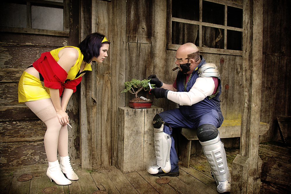 As for the cast, I was Faye Valentine, Jonathan was Spike Spiegel, my sister was Ed, and my poppa was Jet Black. (This was his first cosplay and I am super excited that he decided to join us!) My poppa and I make bonsais for fun every now and again, so we made the one in the pictures for this shoot. We had a lot of friends helping with the photoshoot, from helping with hair and makeup on set, to taking the pictures, to acting as stagehands during the shooting. It was so fun how it all came together.