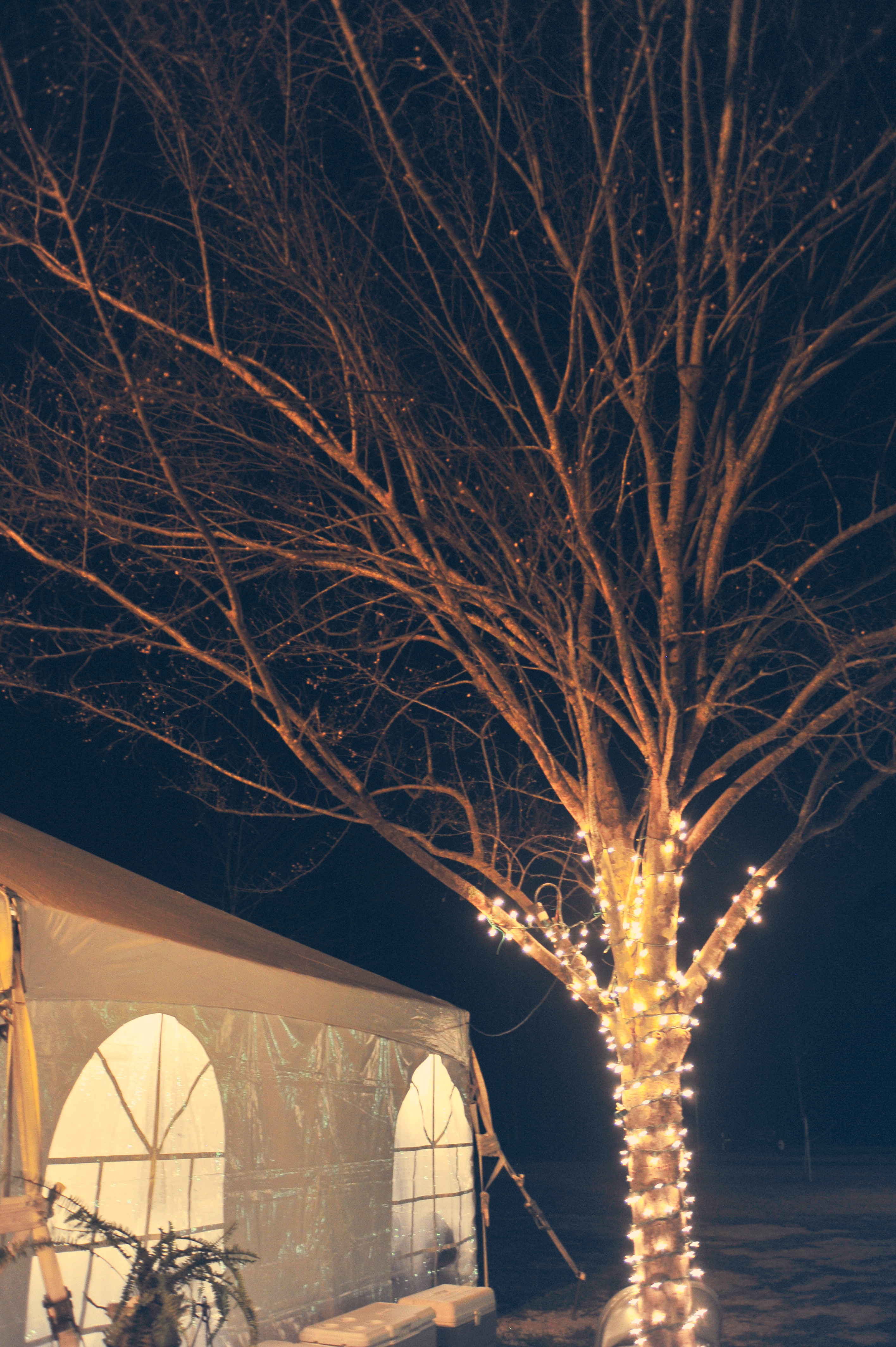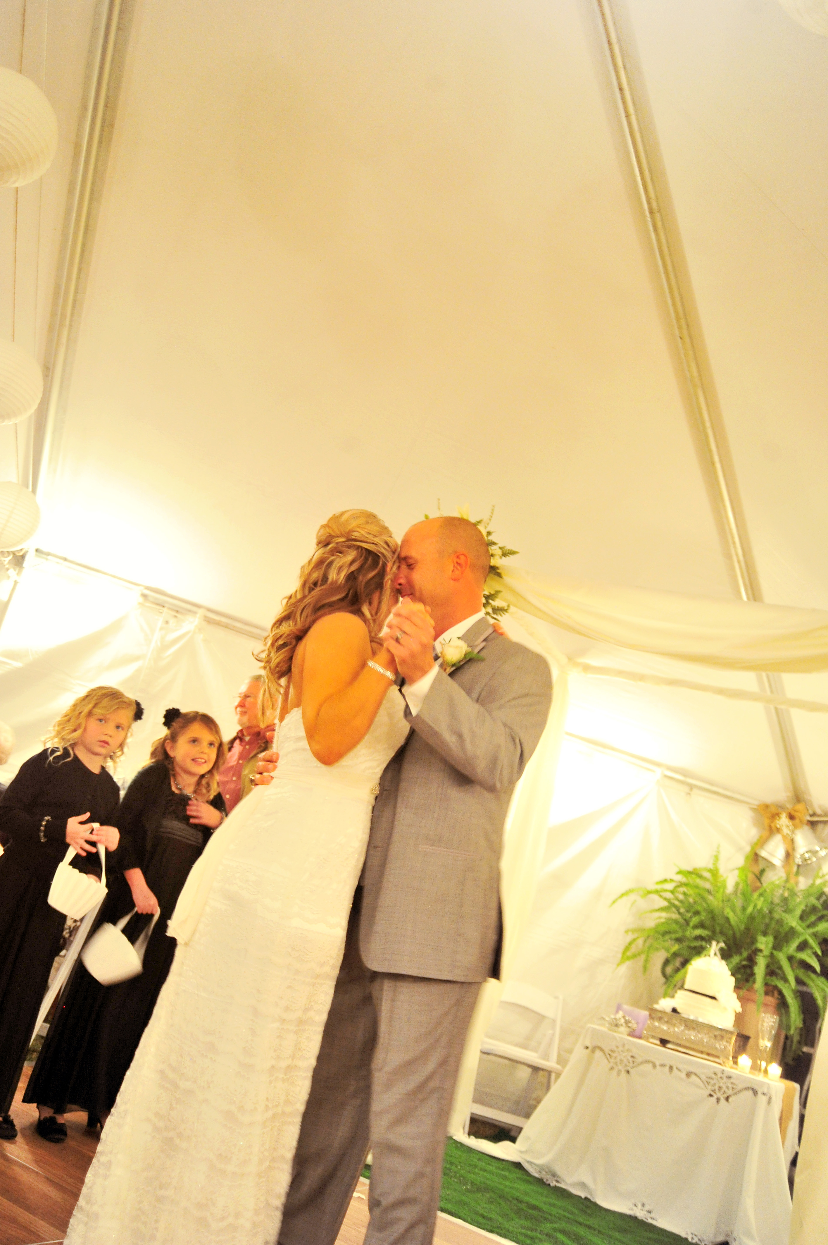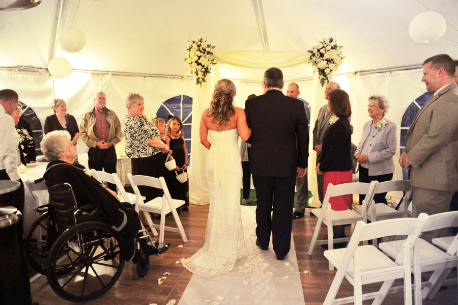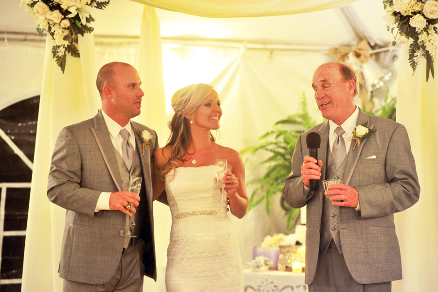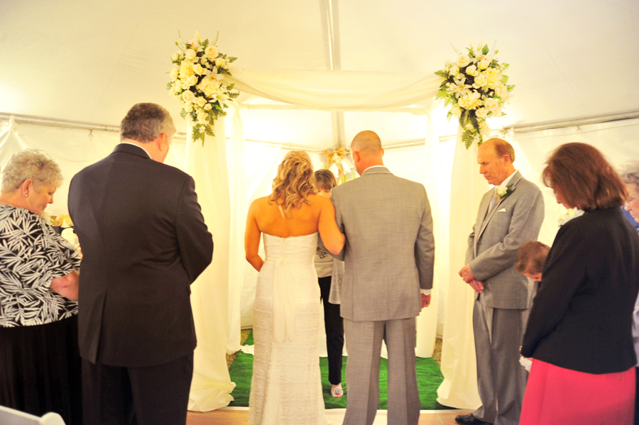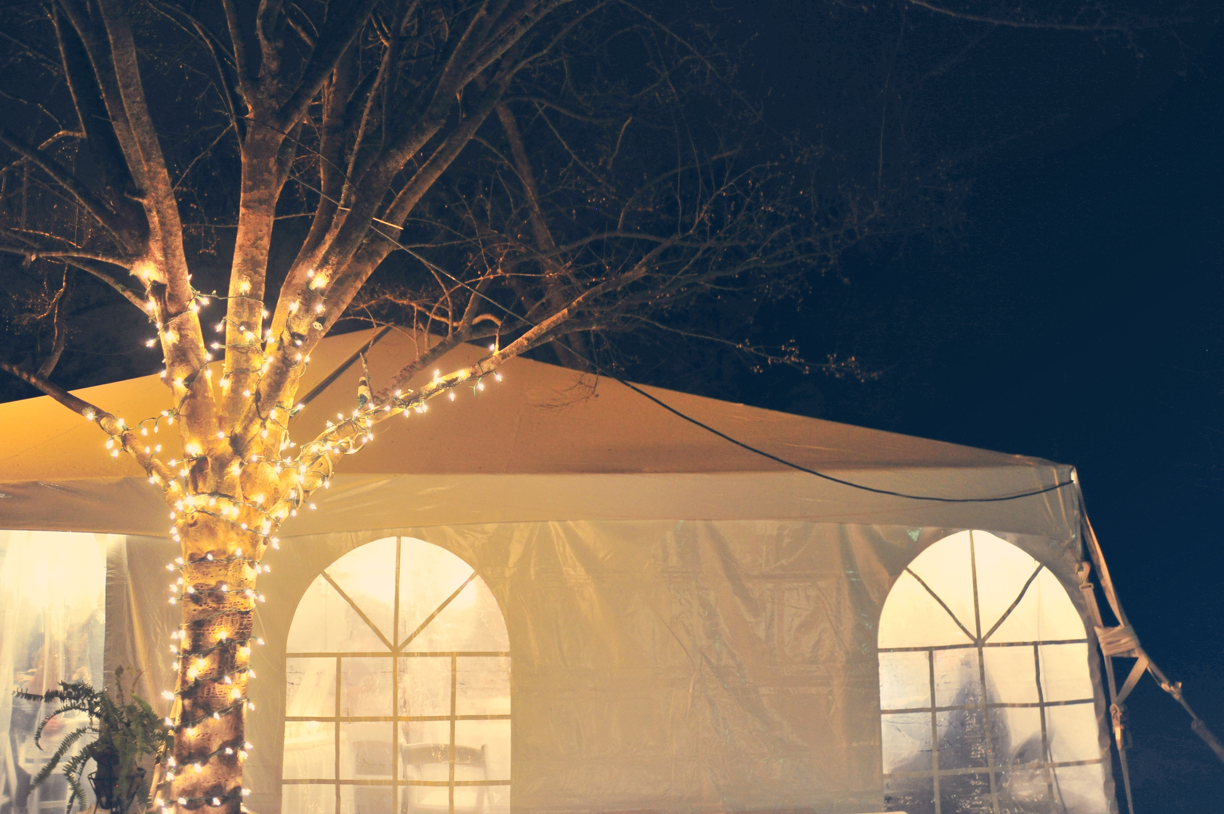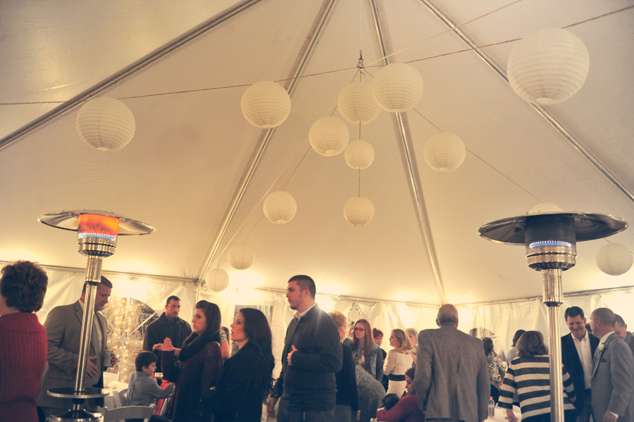 The tent was gorgeous, lit up with candles, lanterns and twinkle lights on the trees outside. I especially liked Kelly’s DIY centerpieces. So simple and elegant!