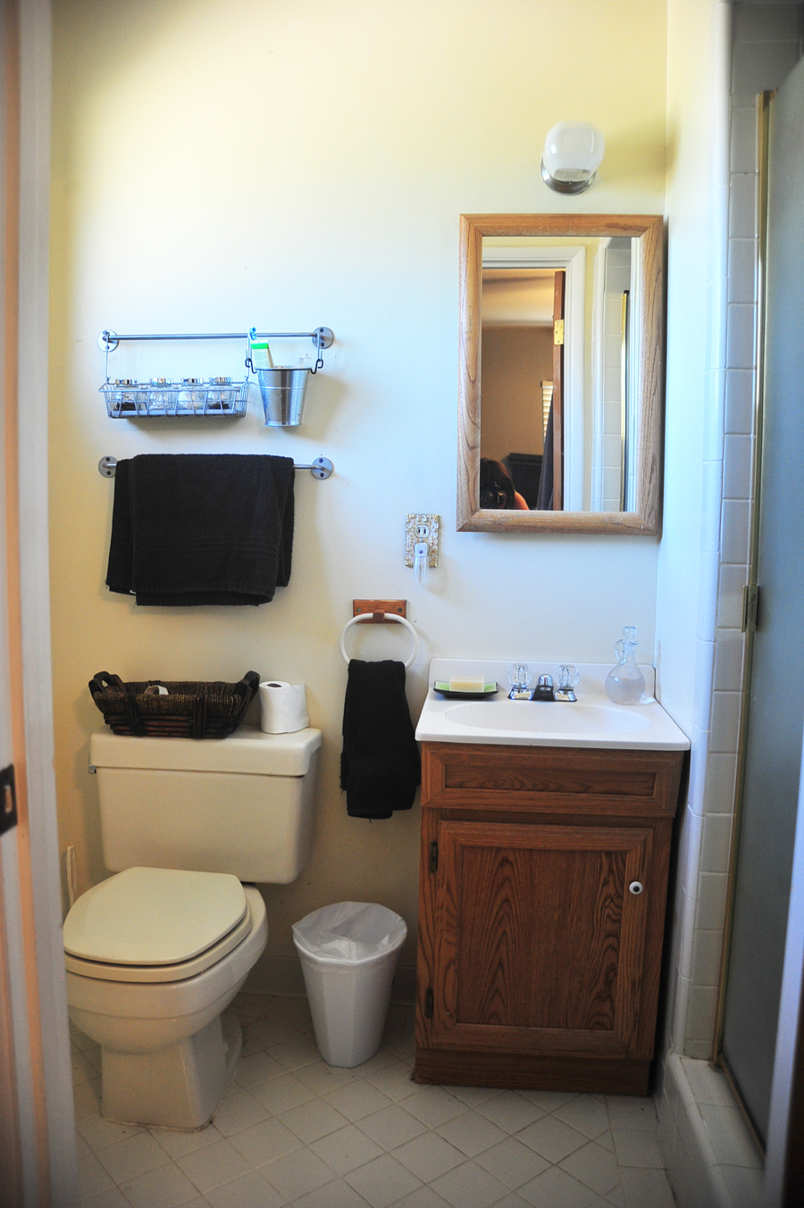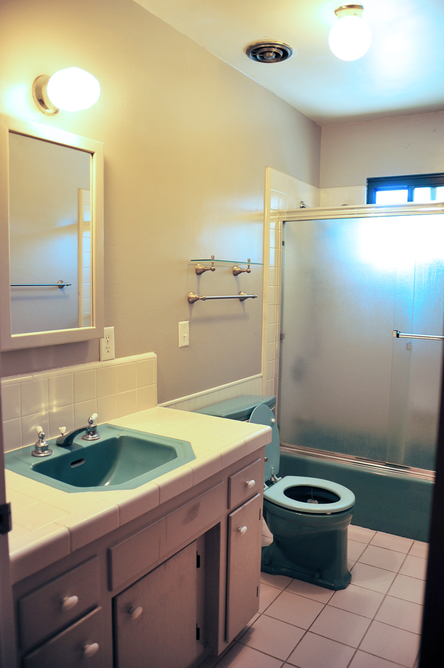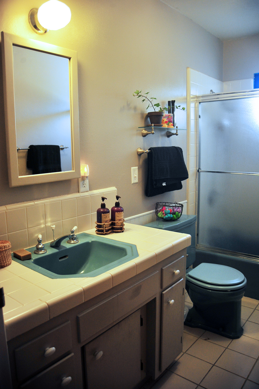 We’re not thrilled with the bathrooms. Aside from having no style, they are old, dated, everything from the grout to the tile to the plumbing is in dire need of repairs – they need a serious overhaul. Unfortunately “fix up bathrooms” is a little lower on our to do list, so maybe we’ll get around to sprucing these puppies up in a few years. Maybe.