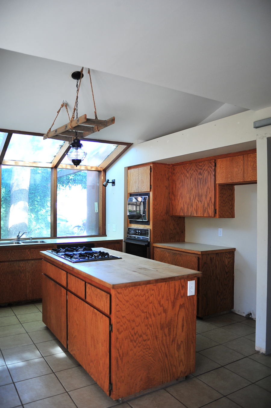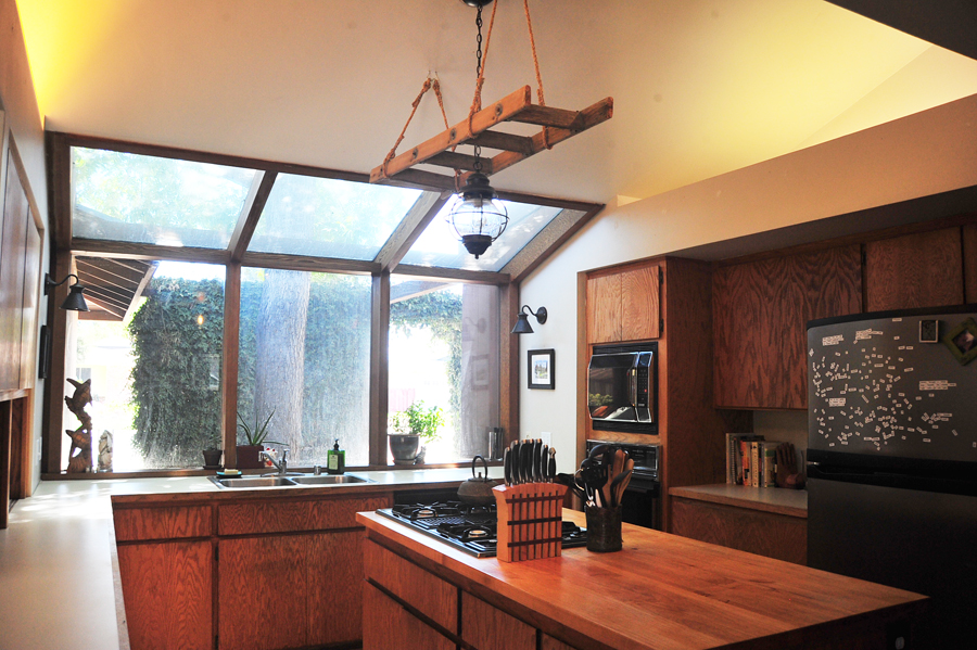 I fell in love with this kitchen through photos before we ever took a tour of the house with an eye to buying it. I love the atrium feel over the kitchen sink, the natural light, the industrial chic feel of the barn door, and light fixtures with their filament bulbs, and the outlay of the kitchen is PERFECT for Jonathan and I, who love to cook. The cutting board island with stovetop is perfect for chopping, cooking, and preparing meals. We can work side to side, across from each other, or any combination! Finally he can work on his cream sauce while I work on my pan seared fish without us bumping elbows or getting in the others way. It’s like we designed this kitchen for ourselves!
