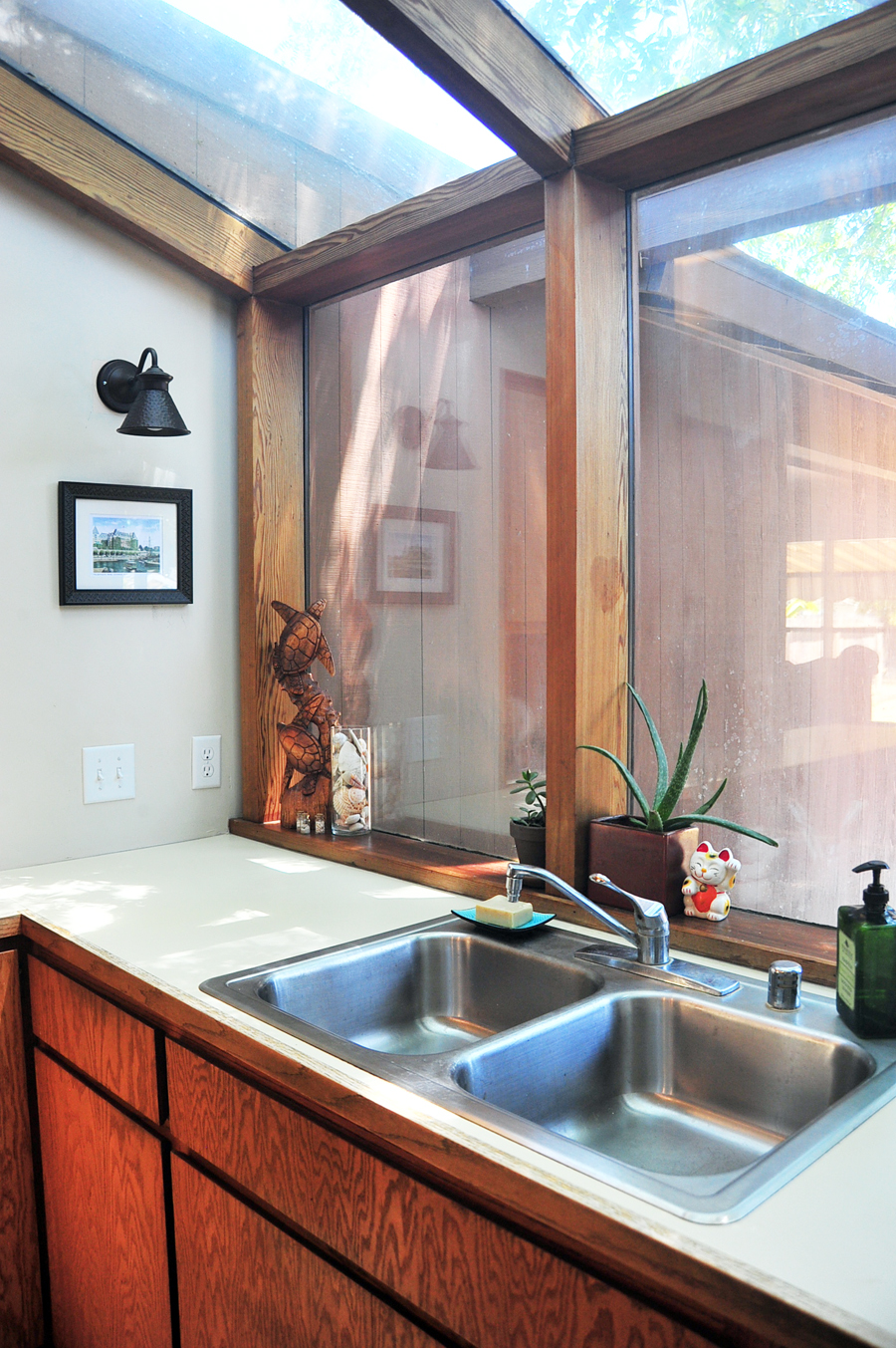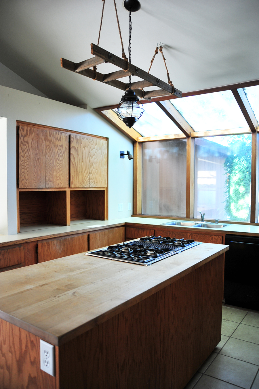 We replaced the light fixtures on the wall that flank the sink with some awesome designer real bronze lights that I found at a swap meet. We also sanded, stained and waxed the chopping board island – I really don’t even WANT to know how long it’s been since it had been cleaned, but that project was a must do since it was covered in dirt encrusted stains, nicks and gouges.