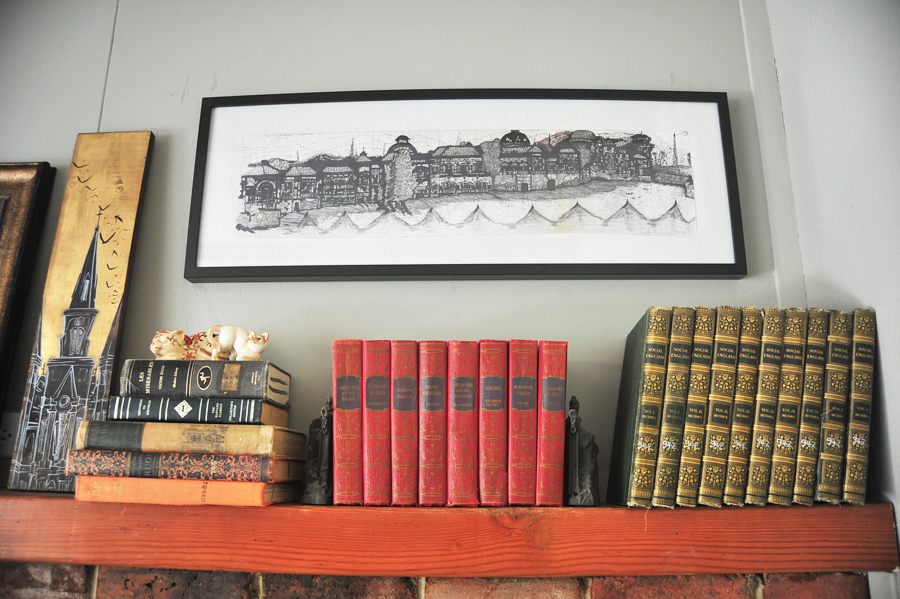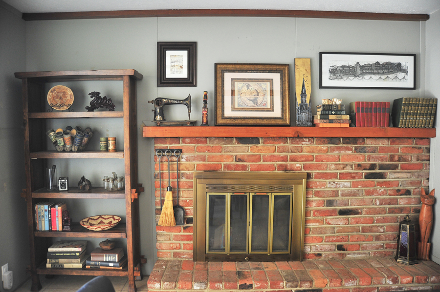 I’m loving using the real masonry brick fireplace as a medium to showcase the various collectibles and knickknacks that Jonathan and I have picked up over the years!